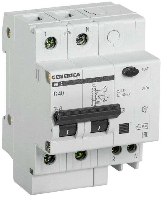 Автоматический дифференциальный выключатель АД12 от GENERICA и IEK - это двухполюсное устройство на 40 А, предназначенное для защиты людей и оборудования от поражения током, перегрузок и коротких замыканий. Устройство монтируется на DIN-рейку и применяется в распределительных щитах жилых, коммерческих и промышленных объектов.