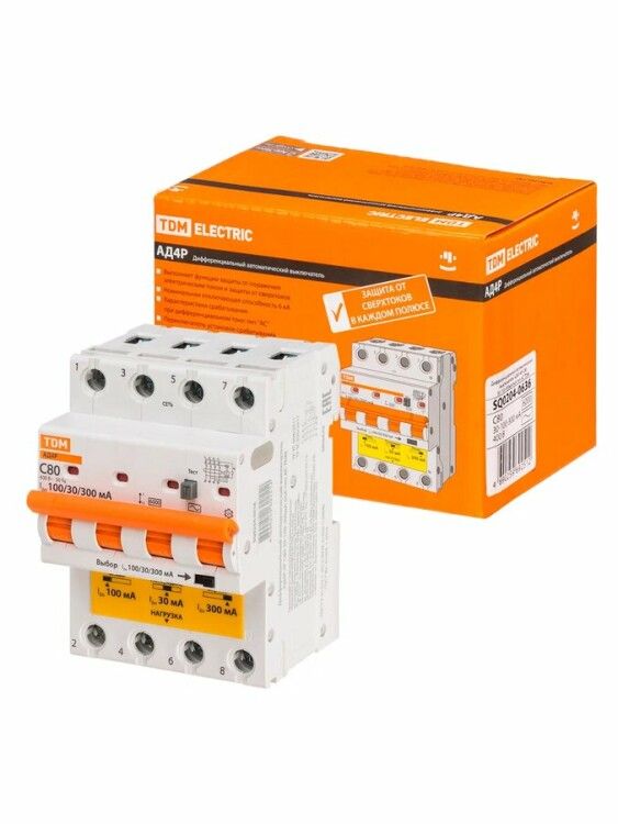 Выключатель автоматический диффренциального тока АД4P 4Р С80 30-100-300мА 6кА тип АС | SQ0204-0636 TDM