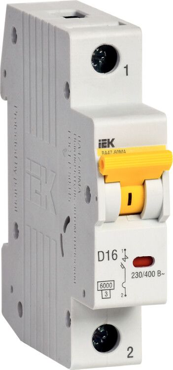 - Выбирая автоматический выключатель модульный 1P 16А 6кА ВА47-60МА без теплового расцепителя, проверьте, есть ли в цепи другой элемент, защищающий от перегрузки - иначе система будет небезопасна