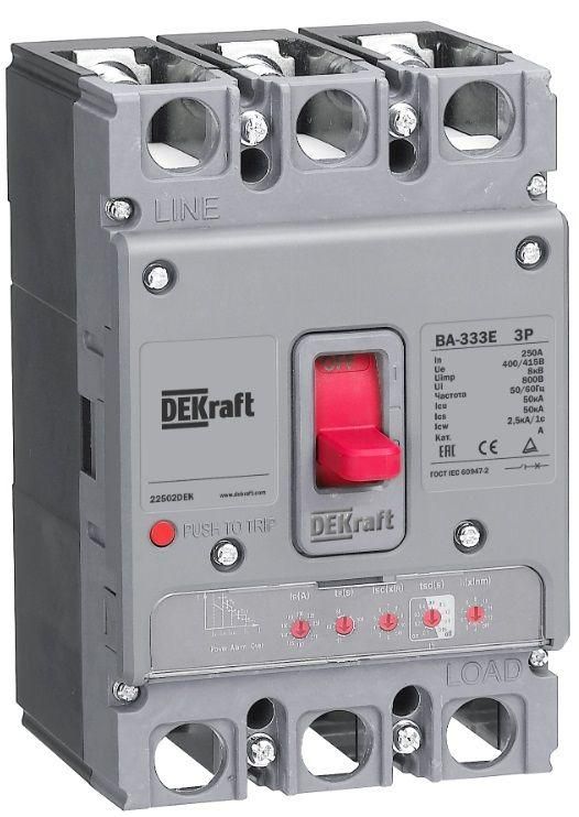 Автоматический выключатель ВА-333E от DEKraft - четырёхполюсный силовой аппарат с электронным расцепителем, предназначенный для защиты сетей переменного тока до 400 В. Номинальный ток 125 А и отключающая способность 50 кА позволяют использовать его в ответственных распределительных системах, где важна точная настройка и надёжность. Артикул 22501dek соответствует модели с монтажом на плату и встроенной защитой от замыканий на землю.