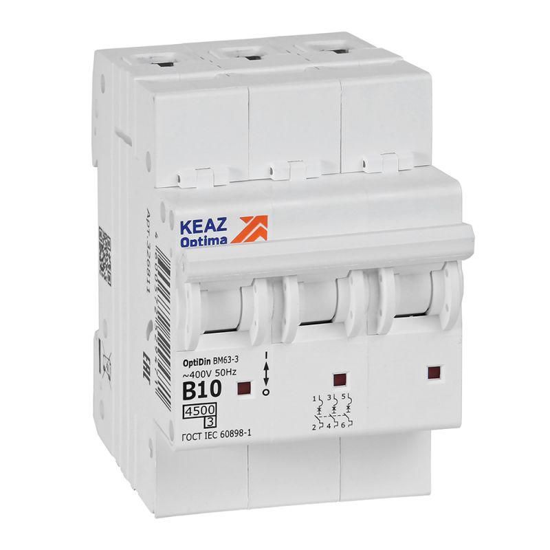 Выключатель автоматический трехполюсный 10А B 4,5кА AC OptiDin BM63-3B10-4,5-УХЛ3 - 329518 КЭАЗ