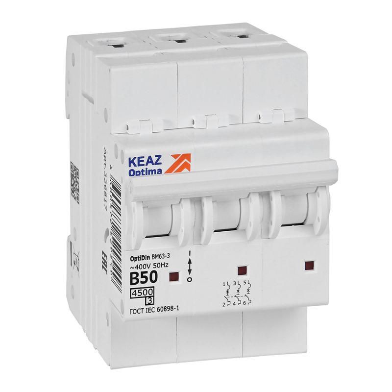 Выключатель автоматический трехполюсный 50А B 4,5кА AC OptiDin BM63-3B50-4,5-УХЛ3 - 329524 КЭАЗ
