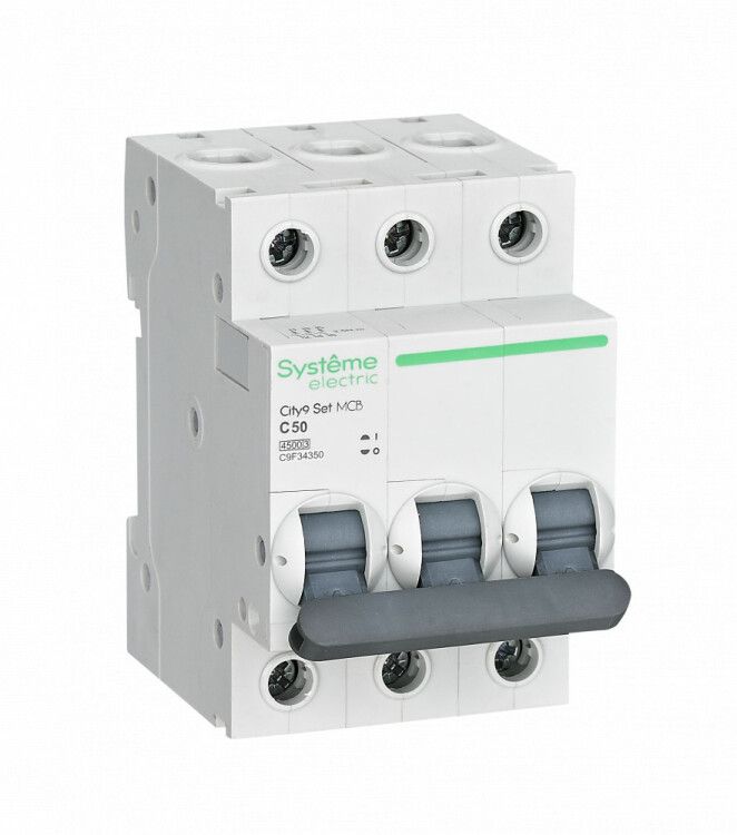 Автоматический выключатель модульный трехполюсный 50А характеристика С 4.5кА 400В от бренда Systeme Electric - надежное устройство для защиты трёхфазных цепей от перегрузок и коротких замыканий. Артикул c9f34350 входит в серию City9 SET и рассчитан на работу в промышленных и коммерческих объектах с напряжением до 400 В.