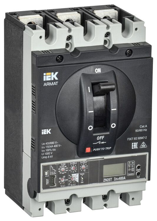 Автоматический выключатель соответствует требованиям ГОСТ IEC 60947-2 и международному стандарту IEC 60947-2. Все изделия линейки ARMAT проходят испытания в собственной лаборатории IEK GROUP в Москве и в независимых сертифицированных центрах. Гарантийный срок - 5 лет, что подтверждает стабильность качества сборки и материалов. Отключающая способность 150 кА соответствует классу K (по IEC 60947-2), что делает аппарат пригодным для использования в местах с высокой потенциальной энергией КЗ - например, рядом с трансформаторами большой мощности.