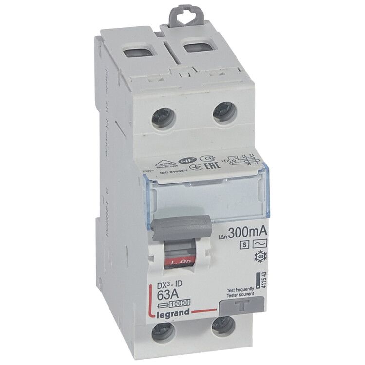 Выключатель дифференциального тока (УЗО) 2-полюсный 63А 300мА тип AC-S DX3 от Legrand обеспечивает защиту от поражения электрическим током и возгорания при утечках тока в бытовых и промышленных сетях. Артикул 411543 - надёжное решение для групповых цепей с высокой нагрузкой.