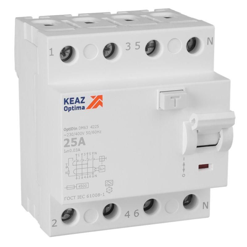 Выключатель дифференциального тока (УЗО) без защиты от сверхтоков 4П 25А 30мА A 4,5кА OptiDin DM63-4225-A-4,5-УХЛ4 - 343915 КЭАЗ