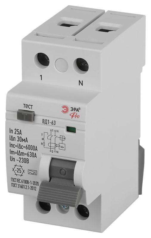 Выключатель дифференциального тока (УЗО) 2п 25А 30мА тип А электромех. ВД1-63 PRO VD2EM25A30 ЭРА Б0061762