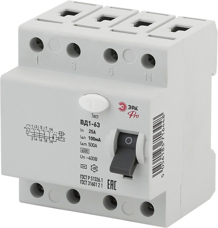 Выключатель дифференциальный (УЗО) (электромеханическое) NO-902-69 ВД1-63 3P+N 25А 100мА Pro | Б0031908 ЭРА