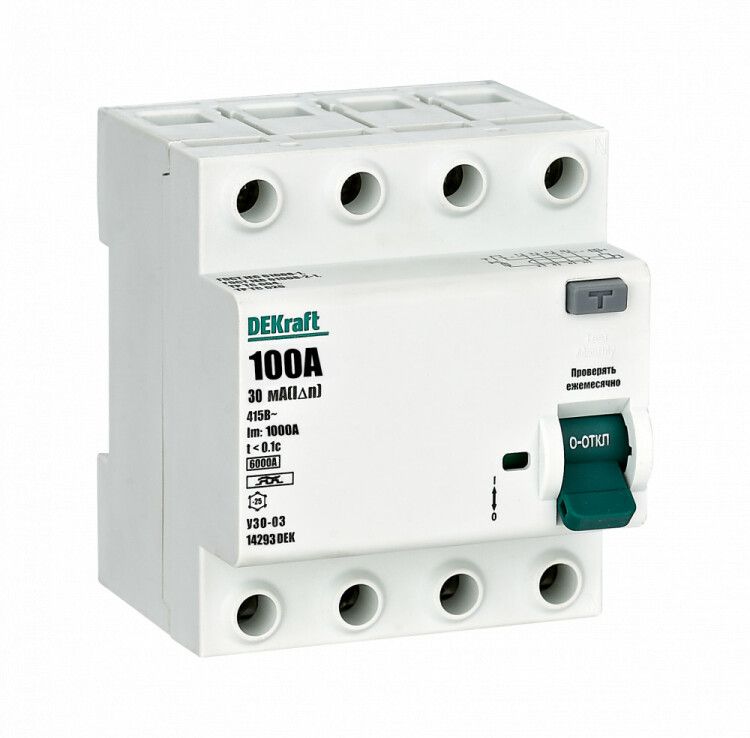 Выключатель дифференциального тока (УЗО) 4-полюсный 100А 30мА тип A 6кА УЗО-03 от DEKraft предназначен для защиты людей от поражения электрическим током и предотвращения пожаров из-за утечек тока в трёхфазных сетях. Это электромеханическое устройство с высокой надёжностью, подходящее для промышленных объектов и крупных бытовых установок.