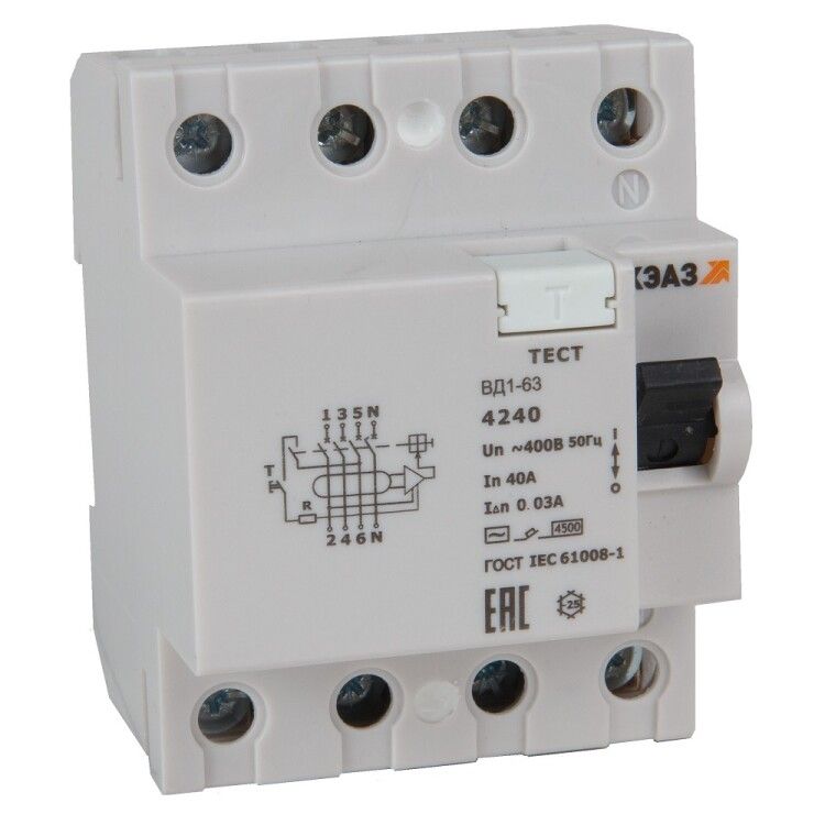 Выключатель дифференциального тока (УЗО) 4-полюсный 32А 30мА ВД1-63-4232-АС-УХЛ4 электронное - это устройство для защиты людей и оборудования от поражения электрическим током при утечках в четырёхпроводных сетях 400 В. Произведённое КЭАЗ, изделие относится к бюджетной серии ВД1-63 и предназначено для установки на DIN-рейку в распределительных щитах.
