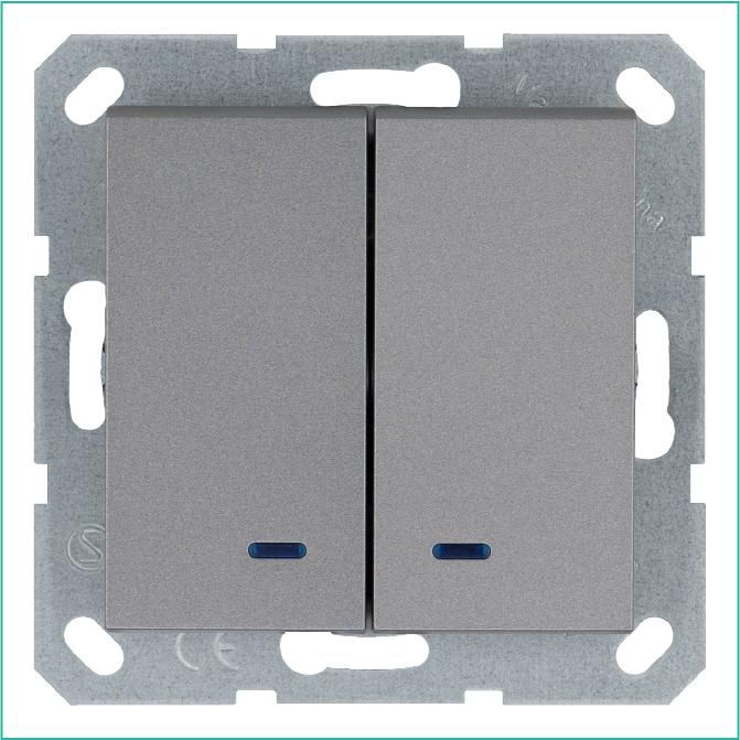 Выключатель двухклавишный 10A 250V~ со светодиодами, алюминий от бренда Jasmart (артикул g3023ns) предназначен для управления двумя группами освещения с одной точки - например, потолочными светильниками и бра - с удобной подсветкой клавиш в темноте.