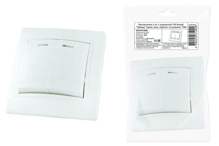 Выключатель двухклавишный с подсветкой 10А белый (серия Таймыр, артикул sq1814-0505) от TDM ELECTRIC предназначен для управления двумя группами освещения в жилых и общественных помещениях. Бакелитовое основание обеспечивает надёжную изоляцию, а подсветка позволяет легко найти выключатель в темноте.