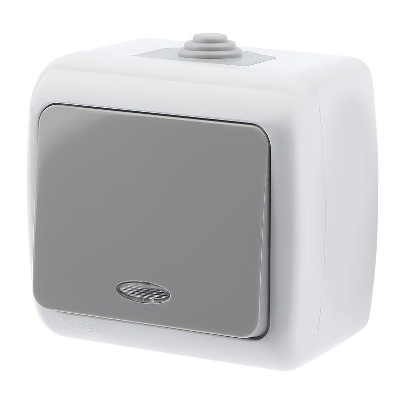 Выключатель Intro Atlantic 5-102-03 с подсветкой, 10А-250В, IP54, открытой установки, серый ЭРА - Б0050941
