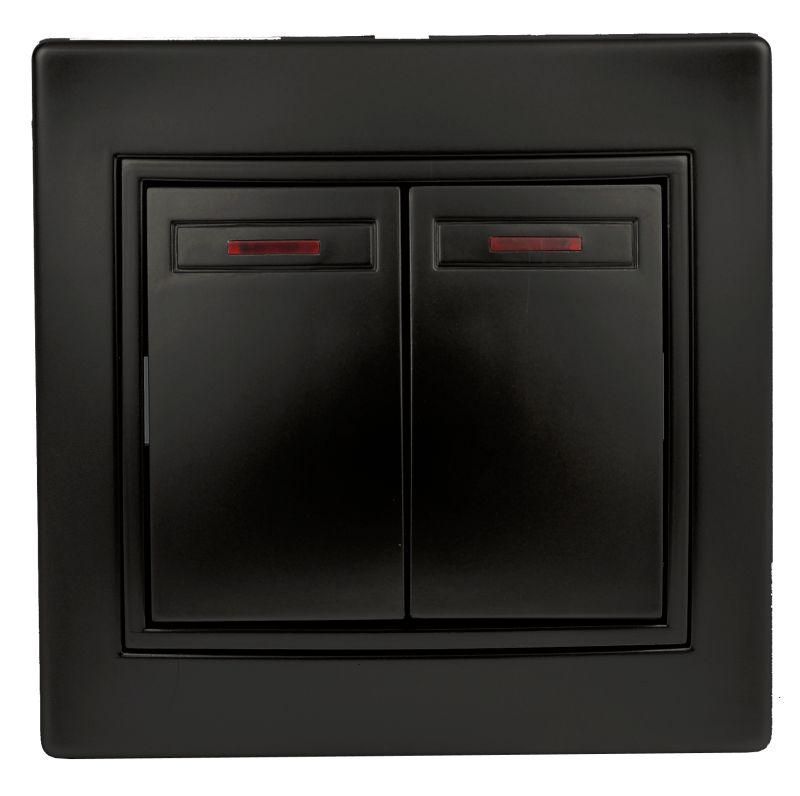 Выключатель двухклавишный 2-модульный с подсветкой ЭРА Intro Plano (артикул б0053780) предназначен для управления двумя группами светильников в помещениях с внутренней проводкой. Механизм с глянцевой антрацитовой накладкой и светодиодной индикацией обеспечивает комфортную работу в темноте, а прочный термопласт делает его безопасным для длительного использования.
