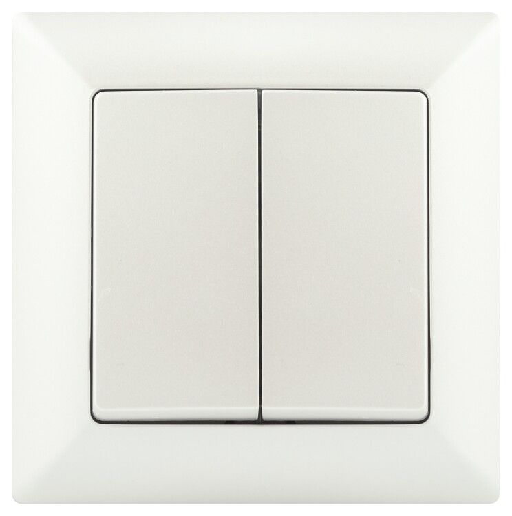 Выключатель двухклавишный 10А 250В IP20 СУ перламутр Solo 4-104-06 - устройство для управления двумя группами светильников или нагрузок в помещениях с внутренней проводкой. Произведён в серии Intro Solo, сочетает надёжную конструкцию, глянцевую перламутровую отделку и совместимость с системами скрытой установки.