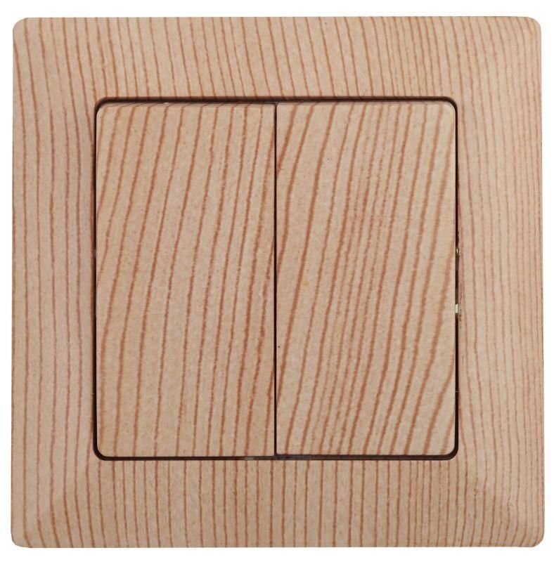 Выключатель двухклавишный 10А-250В, IP20, СУ, сосна, серия Solo 4-104-11 - устройство для управления двумя группами светильников или нагрузок в жилых и офисных помещениях. Произведён компанией ЭРА в серии Intro Solo, совмещает надёжную конструкцию, простую установку и эстетичный внешний вид в отделке «сосна». Артикул 4-104-11 соответствует требованиям для скрытой проводки.
