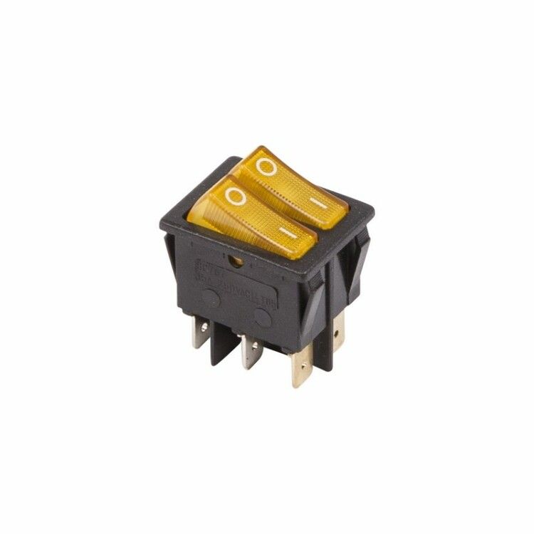 Выключатель клавишный 250V 15А (6с) ON-OFF желтый с подсветкой двойной от Rexant (арт. 36-2413) - двухпозиционный переключатель с LED-подсветкой для управления двумя независимыми цепями переменного тока до 250 В. Подходит для встраивания в корпуса оборудования, где важна визуальная индикация состояния.