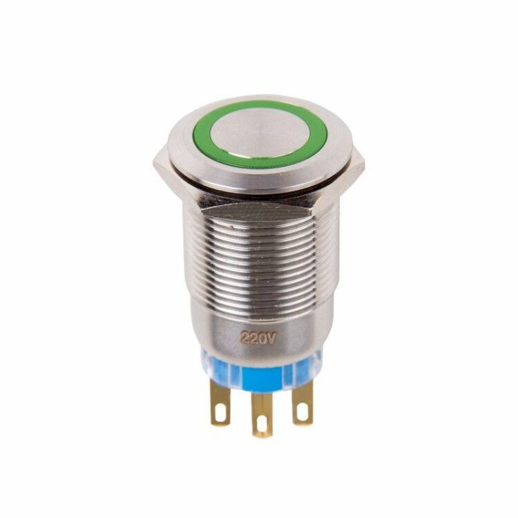 Антивандальная кнопка 19 12В Фикс (5с) ON-OFF/OFF-ON подсв/зеленая REXANT представляет собой выключатель-кнопку, предназначенную для коммутации электрических цепей напряжением до 12В путем включения-выключения питающего провода. Это металлическая кнопка, которая используется в местах с высоким риском повреждения (на производственных линиях, в лифтовых кабинах, около входной двери и т.д.), а также для декоративного оформления панелей управления.