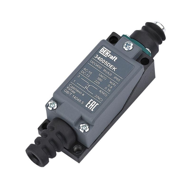 Выключатель концевой металлический 1 нормально открытый 1 нормально закрытый кнопочный плунжер от DEKraft (арт. 34005dek) - надёжный коммутационный элемент для фиксации положений в автоматизированных системах. Он сочетает два контакта (НО и НЗ), прочный пластиковый корпус с высокой степенью защиты и механическую долговечность до миллиона циклов.