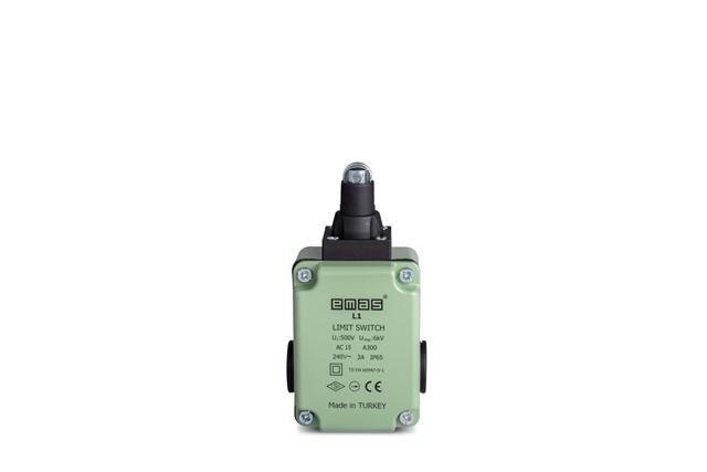 Выключатель концевой линейный 3-х направленный с пластмассовой консолью и стальным плунжером, роликовый Ф13мм (1НО+1НЗ) от бренда EMAS - надёжный коммутационный элемент для фиксированного определения положения движущихся частей оборудования. Артикул L1K23MUM331 предназначен для работы в условиях механических нагрузок и требует минимального обслуживания.
