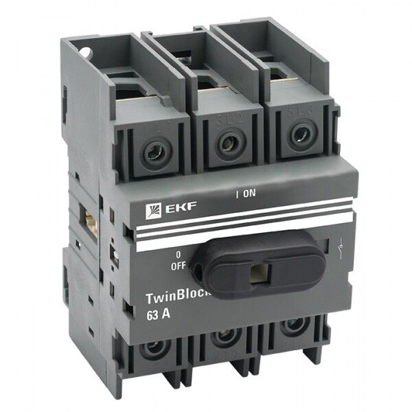 Рубильник 63 ампер 3 полюса с рукояткой управления для прямой установки TwinBlock используется для ручного отключения и включения трёхфазных электрических цепей. Он выполняет функции главного выключателя, сервисного выключателя и устройства аварийной остановки. Подходит для установки в распределительные щиты на DIN-рейку. Применяется в системах питания станков, конвейеров, насосов, компрессоров и других промышленных потребителей с активной или слабоиндуктивной нагрузкой.