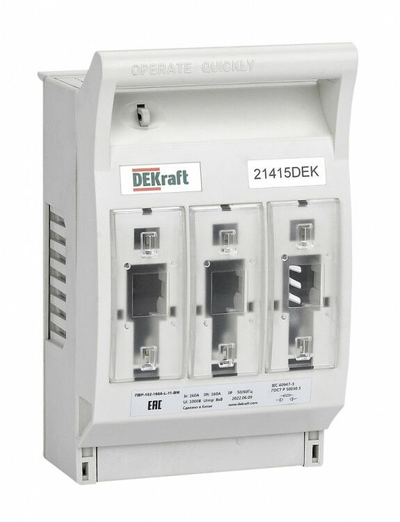 Выключатель-разъединитель-предохранитель ПВР-102 от DEKraft - комбинированное устройство для безопасного отключения трёхфазной нагрузки до 160 А с видимым разрывом цепи и встроенным предохранителем. Подходит для установки на DIN-шину в распределительных щитах промышленного оборудования.