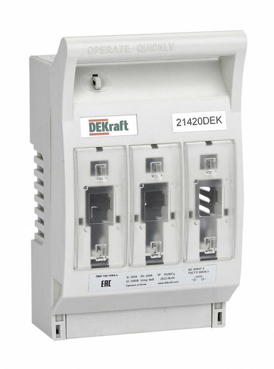 Выключатель-разъединитель-предохранитель ПВР-102 от DEKraft - комбинированное устройство для безопасного отключения трёхфазной нагрузки до 160 А с видимым разрывом цепи. Подходит для установки на монтажную плату в распределительных щитах промышленного оборудования.