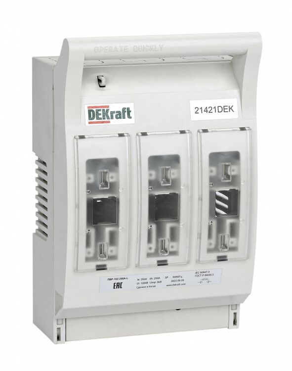 Выключатель-разъединитель-предохранитель ПВР-102 от DEKraft - комбинированное устройство для безопасного отключения и защиты трёхфазных цепей до 250 А. Подходит для установки на монтажную плату в распределительных щитах промышленного оборудования.