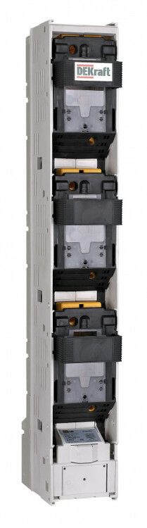 Выключатель-разъединитель-предохранитель вертикальный 630А пофазное отключение ПВР-101 от DEKraft - устройство для безопасного отключения трёхфазной нагрузки с видимым разрывом цепи, рассчитанное на ток до 630 А и напряжение до 690 В. Монтируется на DIN-шину, подходит для распределительных щитов промышленного оборудования.