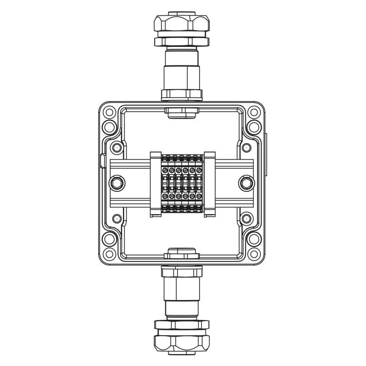 Клеммная коробка взрывозащищенная из алюминия TBE-A-12-(6xCBC.2)-1xKAEPM2MHK-20(A)-1xKAEPM2MHK-20(C) 1Ex e IIC Т5 Gb / Ex tb IIIC T95C Db IP66 имеет два универсальных кабельных ввода KAEPM2MHK-20 - один на стороне A, второй на стороне C. Оба ввода рассчитаны на кабели с наружным диаметром 5,8–12 мм, подходят как для бронированных, так и для небронированных проводов. Диаметр резьбы M20×1,5 совместим с большинством стандартных кабельных вводов. Для монтажа используйте болты через отверстия в основании корпуса. Убедитесь, что кабельные вводы плотно затянуты - это сохраняет степень защиты IP66. Не допускается использование вводов других типов без проверки сертификации взрывозащиты.
