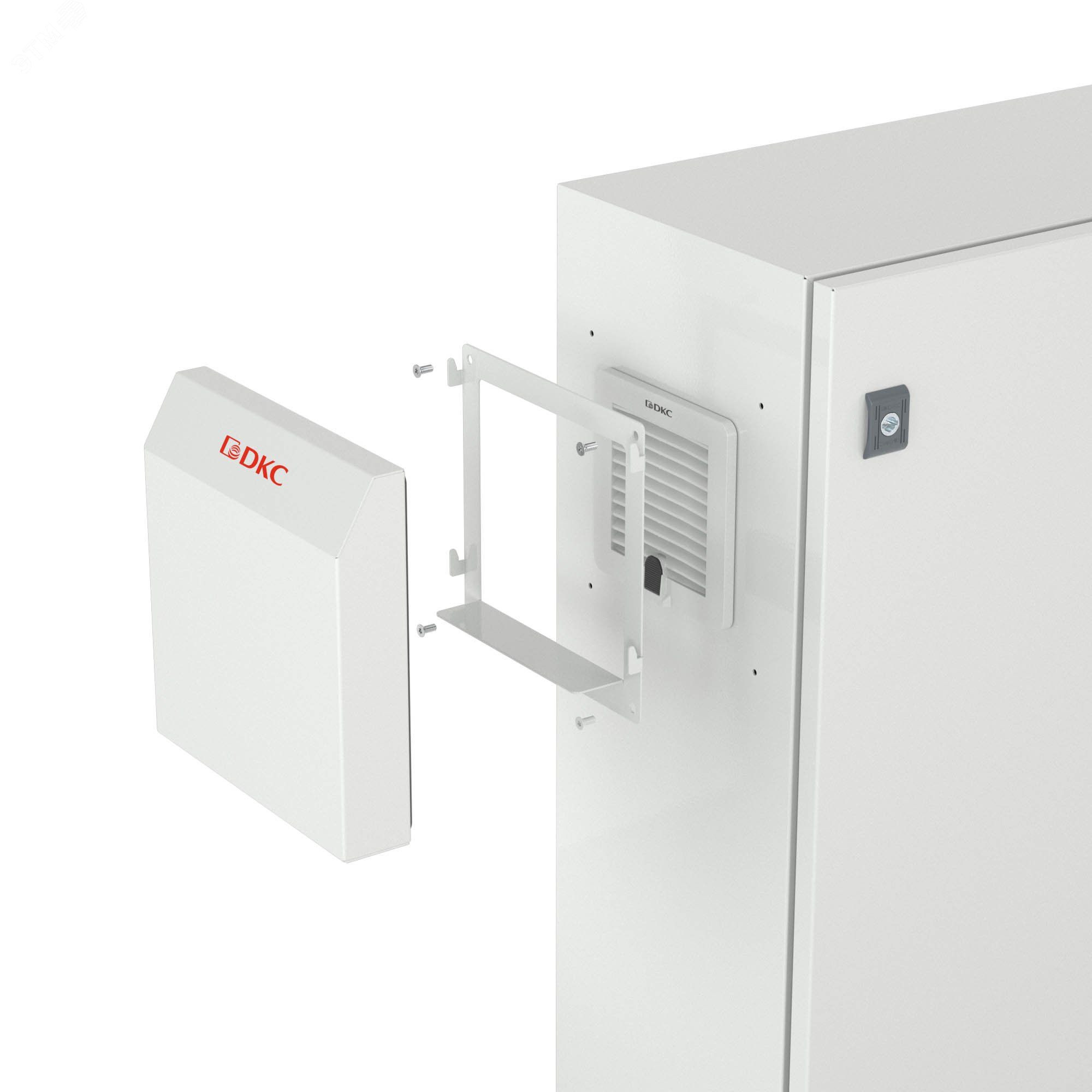 Защитная панель IP56 от DKC (арт. r5rk15b) - металлический экран из листовой стали с порошковым покрытием, устанавливаемый поверх вентиляторов и решёток размером 250×250/252×252 мм для повышения класса защиты до IP56 и защиты от механических повреждений.