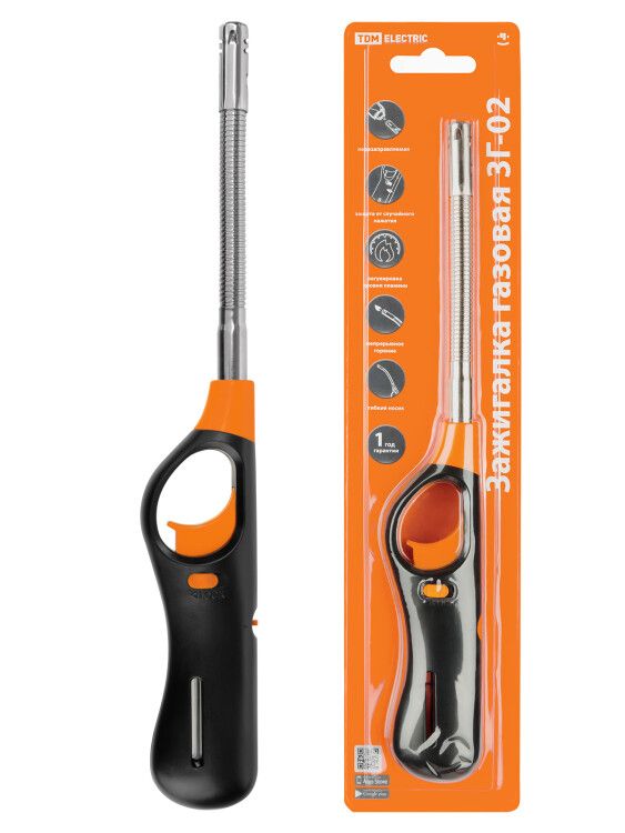 Зажигалка газовая с пьezoэлементом TDM ELECTRIC, модель ЗГ-02 - удобный инструмент для точечного зажигания газовых плит, каминов, баллонов и других устройств, где требуется управление пламенем. Многоразовая заправка и гибкий носик обеспечивают долгий срок службы и универсальность применения.