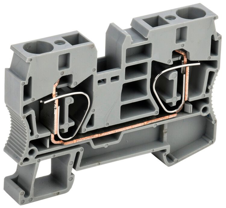 Клемма пружинная КПИ 2в-10 70А серая совместима со всеми стандартными DIN-рейками 35 мм. Для правильной работы необходимо использовать замыкающую пластину - она обеспечивает гальваническую связь между соседними клеммами и позволяет формировать последовательные цепи. Монтаж выполняется просто: защёлкивается на рейку, затем зажим открывается кнопкой, вставляется провод, кнопка отпускается - контакт плотно фиксируется. Провода можно подключать как с наконечниками, так и голые - главное, чтобы сечение попадало в диапазон 4–16 мм2.