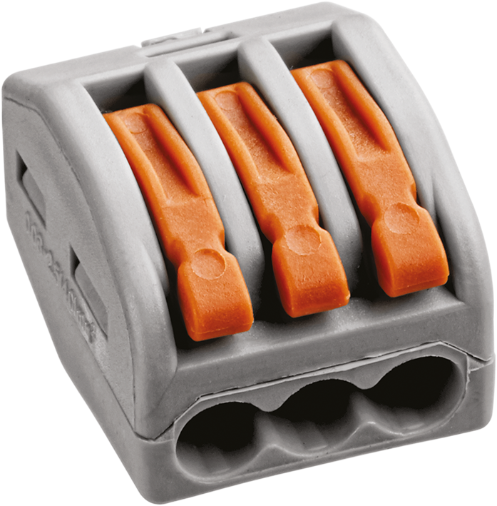 Клемма NTC-R-3 с рычагом монтируется непосредственно на кабель - не требует панели или DIN-рейки. Для подключения: опустите рычаг, вставьте провод до упора, поднимите рычаг. Надежное соединение фиксируется за счет пружины. Максимальный диаметр изоляции провода - не более 8 мм. Убедитесь, что конец провода зачищен равномерно, без заусенцев.