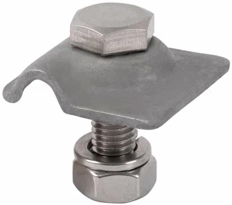 Зажим совместим с любыми поверхностями, где возможно просверливание отверстия под М8. Устанавливается на бетон, металл, дерево с помощью перфоратора или сверла. Для монтажа требуется ключ на 13 мм для затяжки винта. Гайка и шайба обеспечивают равномерное распределение нагрузки и предотвращают деформацию поверхности. Диаметр отверстия в основании должен соответствовать размеру винта M8 - не менее 8,5 мм.