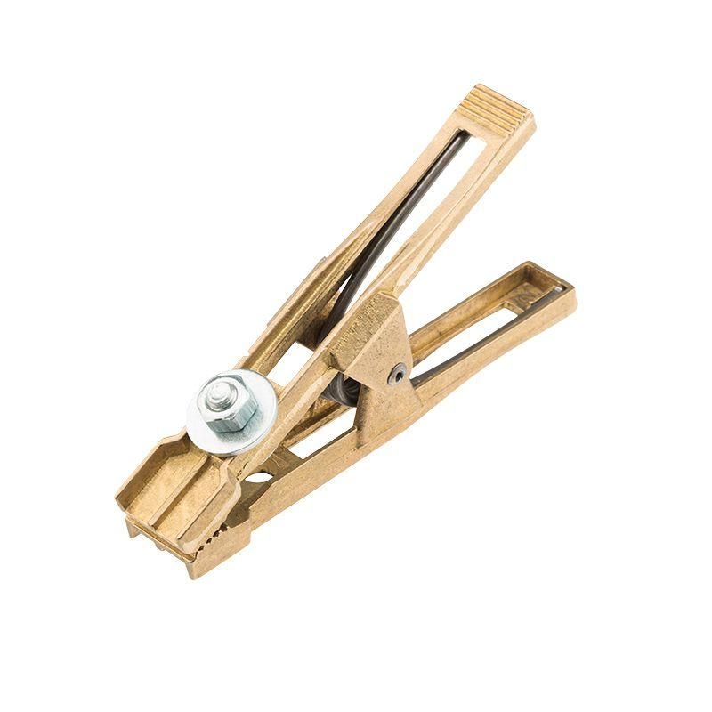 Зажим типа "крокодил" 400А 170мм для сварки (латунь) совместим со всеми стандартными сварочными кабелями сечением до 35–50 мм2. Кабель фиксируется через болтовое соединение внутри корпуса - достаточно затянуть гайку отверткой. Установка занимает менее минуты: просто закрепите кабель, затем зафиксируйте зажим на чистую металлическую поверхность. Для лучшего контакта рекомендуется предварительно зачистить место присоединения от ржавчины, краски или масла.