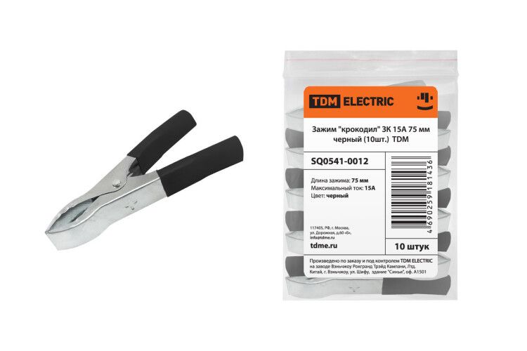 Зажим крокодил ЗК 15А 75мм черный (10 шт) от TDM ELECTRIC предназначен для временного подключения измерительных приборов к электрическим цепям. Комплект из десяти зажимов обеспечивает надёжный контакт при диагностике, ремонте и настройке оборудования.