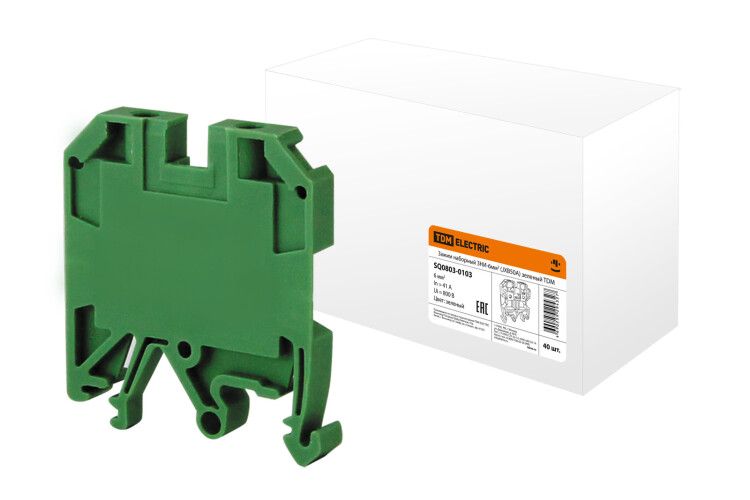 Зажим наборный ЗНИ-6мм2 (JXB50А) зеленый - это изолированный одноуровневый коммутирующий элемент на DIN-рейку, предназначенный для надежного и безопасного соединения проводов в распределительных шкафах и технологических щитах. Бренд TDM ELECTRIC обеспечивает соответствие изделия промышленным требованиям к прочности, изоляции и долговечности.