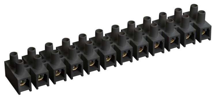 Зажим винтовой ЗВИ-15 негорючий 4.0-10 кв.мм (2 шт.) черный монтируется непосредственно на DIN-рейку без дополнительных креплений. Его ширина 23 мм соответствует стандартным рейкам, используемым в бытовых и промышленных щитах. Для подключения: оголите конец провода на 8–10 мм, вставьте его в гнездо до упора и затяните винт отверткой до устойчивого сопротивления - не переусердствуйте, чтобы не повредить контактную пластину. Оба зажима на одном полюсе работают параллельно - можно подключить два провода одного сечения, например, входящий и выходящий.