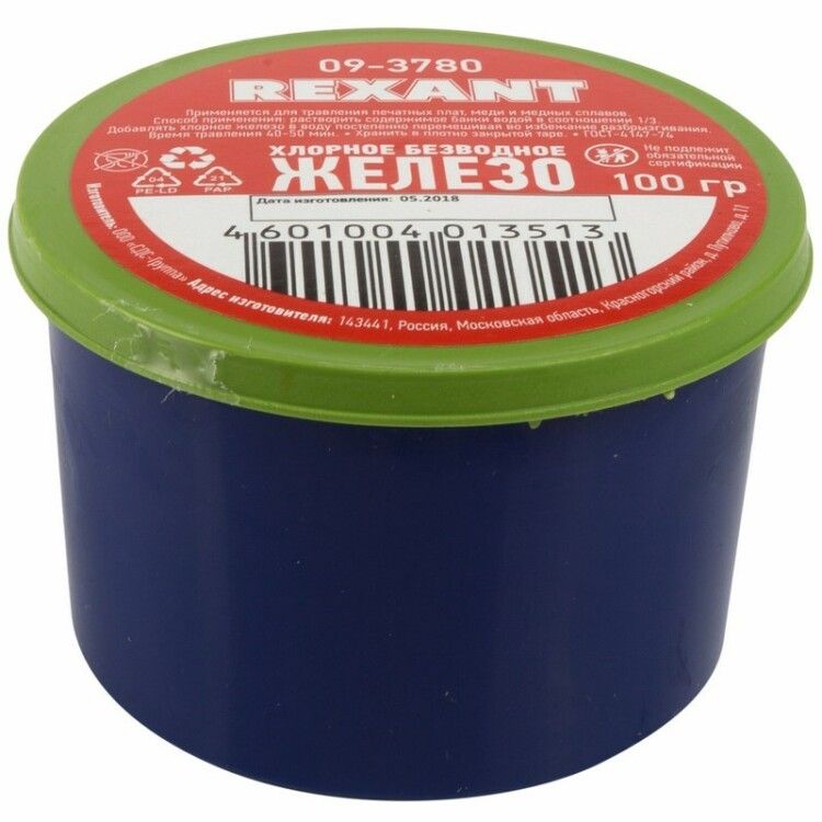 Хлорное железо 100 грамм REXANT используется исключительно для химического удаления меди и её сплавов с поверхности диэлектрических оснований - то есть для изготовления печатных плат. Применяется в электронной промышленности, приборостроении, ремонте и самодеятельности. Подходит для точечного травления, создания односторонних и двусторонних плат, а также для устранения лишнего металла после фотолитографии.