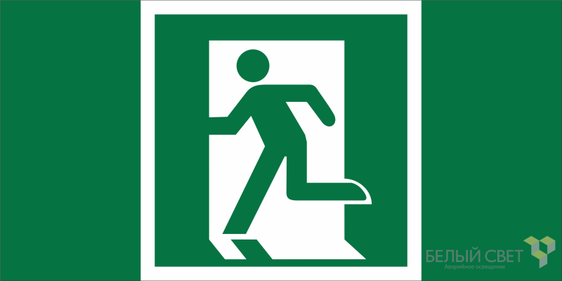 Знак соответствует требованиям ГОСТ 12.4.026-2015, который регламентирует цветовое оформление, форму и размеры предупредительных и информационных знаков безопасности. Цветовая комбинация - белый фон с зеленым символом - используется исключительно для обозначения безопасного выхода, чтобы отличать его от красных знаков запрещающего характера.