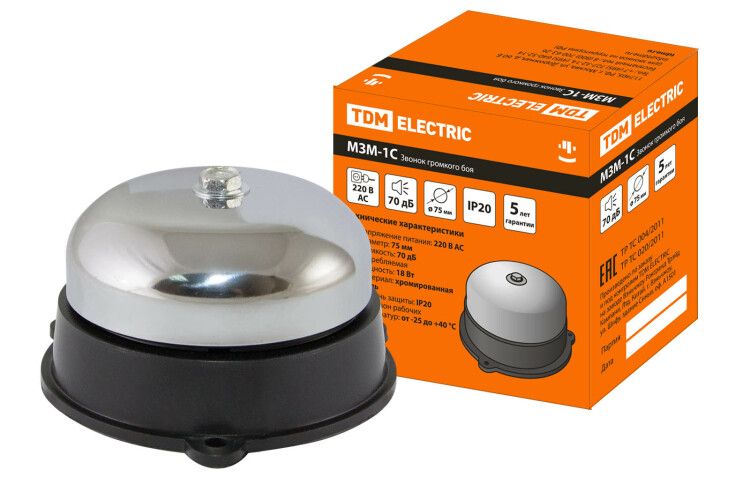 Звонок громкого боя МЗМ-1С-075мм 70дБ 220В от TDM ELECTRIC - это устройство, предназначенное для подачи мощных звуковых сигналов с хорошей слышимостью на большом расстоянии. Он идеально подходит для использования в системах сигнализации и оповещения в различных административных, промышленных, сельскохозяйственных и торговых объектах, а также в образовательных учреждениях.