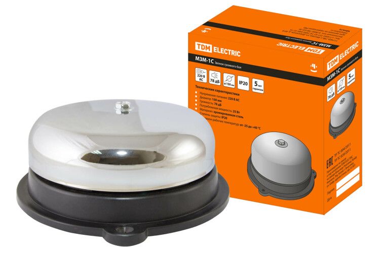 Звонок громкого боя МЗМ-1С-150мм 78дБ 220В | SQ1903-0008 TDM ELECTRIC предназначен для использования в однофазных электрических сетях переменного тока напряжением 220В и частотой 50 Гц. Он обладает высокой громкостью звука - 78 дБ, что обеспечивает хорошую слышимость на больших расстояниях.